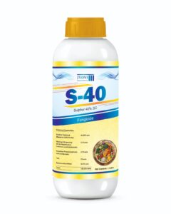 Sulphur 40% SC is a broad-spectrum contact and protectant fungicide with acaricidal action. It effectively controls powdery mildew, rusts, and mites while also acting as a secondary nutrient to improve crop health. Being eco-friendly and residue-safe, it is widely used in integrated disease management.